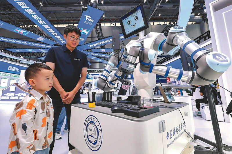 9月20日,在合肥滨湖国际会展中心,小朋友与中国科学技术大学展示的数据驱动的全流程机器化学家互动。 张大岗程兆范柏文王兰兰摄