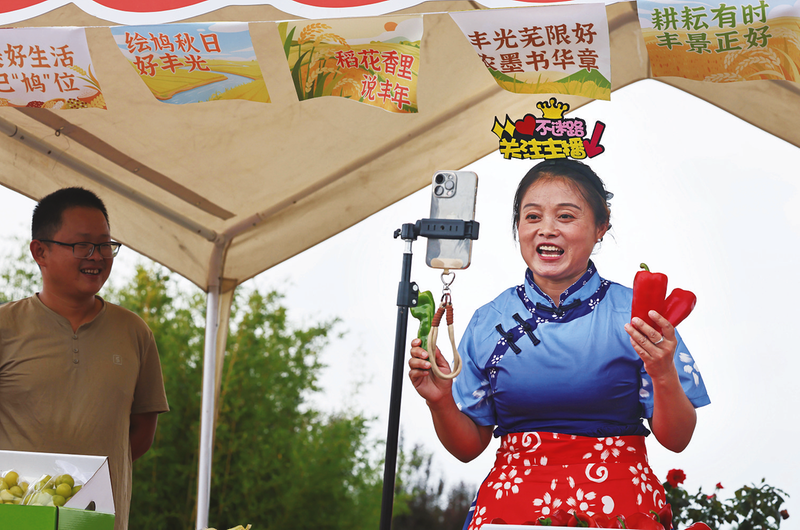 9月23日,在芜湖市鸠江区白茆镇套北村举办的2025年中国农民丰收节芜湖主场活动中,鸠江区沈巷镇凤城村莉姐蔬菜种植场负责人施以丽通过直播销售农产品。自2020年起,芜湖市鸠江区沈巷镇凤城村莉姐蔬菜种植场负责人施以丽尝试通过网络销售自产辣椒、毛豆等农产品,并在抖音等平台分享田园生活与种植过程,坚持以“自然成熟、现摘现发”为特色,吸引超过10万粉丝关注。她在勤劳致富的同时,积极帮助乡邻拓展销路,并无偿传授直播经验,带动乡亲共同增收,被亲切称为“辣椒姐”。 王玉实 摄