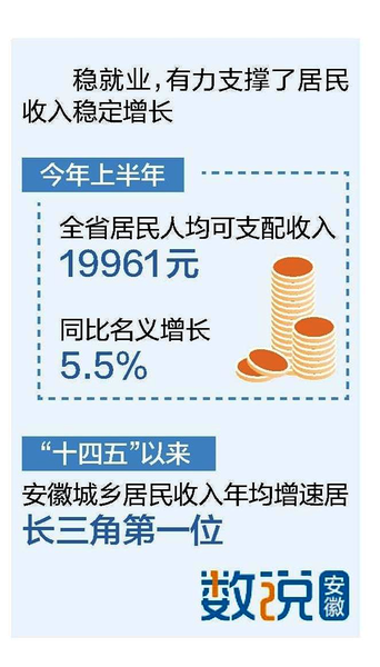 稳就业,有力支撑了居民收入稳定增长。1月至7月,全省城镇新增就业47.5万人,完成年度目标任务的69.86%,超序时进度11.53个百分点。今年上半年,全省居民人均可支配收入19961元,同比名义增长5.5%。“十四五”以来,安徽城乡居民收入年均增速居长三角第一位。