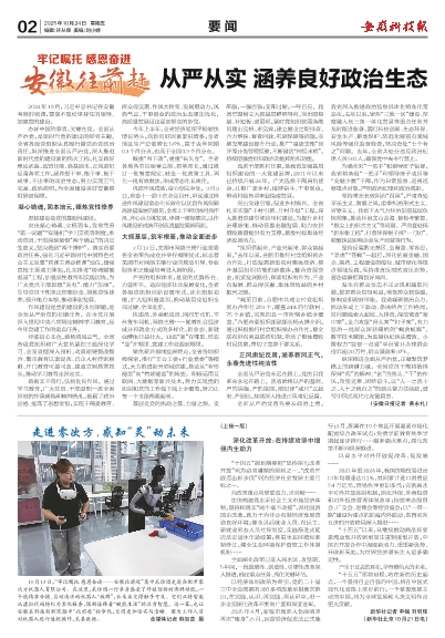 纵深推进全面从严治党,正凝聚筑梦路上的磅礴力量。全省党员干部将始终保持“闯”的精神、“创”的劲头、“干”的作风,攻坚克难、团结奋斗,以“人一之我十之、人十之我百之”的劲头奋力往前赶,谱写中国式现代化安徽篇章。