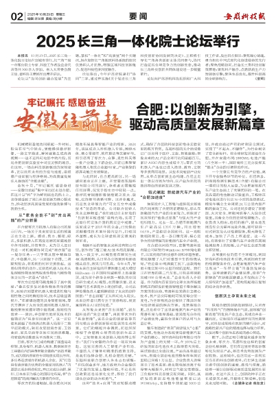 本报讯 10月23日,2025长三角一体化院士论坛在宣城市举行,长三角三省一市部分院士专家、科技工作者及企业代表等共300余人参加。省人大常委会副主任、省科协主席韩军出席并讲话。