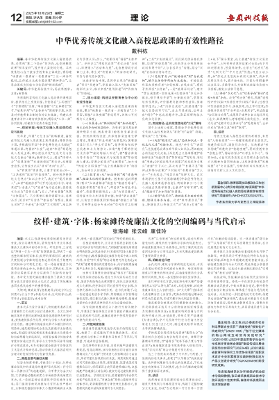 摘要:本文以涟源杨家滩传统建筑为研究对象,探讨其建筑规制、装饰纹样与书法字体在廉洁文化建构中的协同作用。研究表明,三者通过“形制-行为-价值”的逻辑路径,形成了一套完整的廉洁规训体系:纹样的等级标识、建筑的尺度规制与字体的规范表达共同实现了制度的空间转译与可视化呈现。这一传统智慧在当代展现出新的生命力,参数化设计、BIM技术、区块链存证等数字手段为其提供了创新转化的可能。本研究为现代廉政建设提供了兼具文化深度与技术前瞻性的本土化范式,彰显了传统廉洁基因在现代治理中的重要价值。