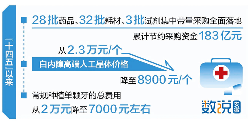 28批药品、32批耗材、3批试剂集中带量采购全面落地,累计节约采购资金183亿元;白内障高端人工晶体价格从2.3万元/个降至8900元/个;常规种植单颗牙的总费用从2万元降至7000元左右……“十四五”以来,安徽交出一份沉甸甸的医保惠民答卷。