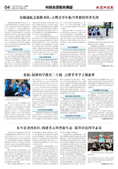 开展科普活动。 安徽通航志愿服务队成立于2019年,始终秉持服务社会、普及航空知识的宗旨。服务队现有注册科技志愿者21人,其中党员6人,均来自安徽通航公司。志愿服务队充分利用业余时间,发挥专业特长,并依托芜湖航空产业园的独特优势,面向青少年系统开展航空科普教育活动,涵盖飞行器研发、制造与运营等环节,为青少年搭建了解芜湖航空产业的桥梁,助力他们实现航空梦想。截至2024年,服务队累计开展科技志愿服务活动200场,荣获2024年度安徽省“最美科技志愿服务组织”称号。