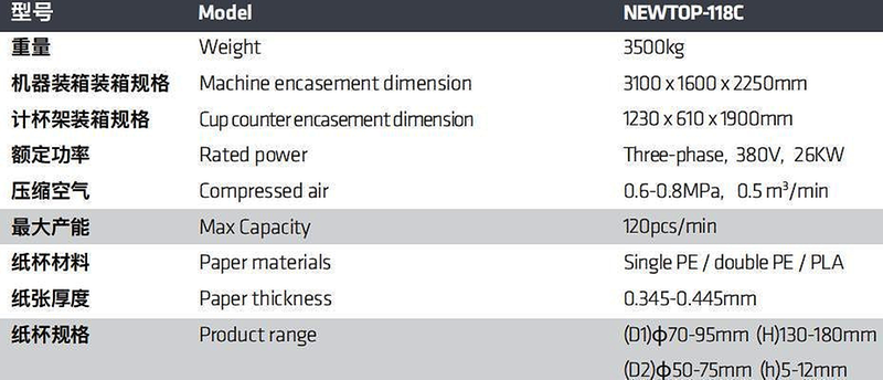 NEWTOP-168S9型高速智能纸杯机,其主机是NEWTOP-138S机型升级款,巧妙地将传动与执行机构分开。传动机构的设计采用了“一横二纵”的动轴布局,而执行机构则采用了直列式的吸送纸与杯筒成型技术,结合10工位公模与9工位母模的双转盘布局,实现了卷边多工位(≥3),让纸容器成型尺寸稳定,卷曲率高,纸张适应性强。该机型配置灵活,选择多样,可满足客户的不同需求:可选配视觉检测系统以剔除不良品。适合生产5-16OZ的高克重、高端品牌冷/热纸杯,如瑞幸、蜜雪冰城、霸王茶姬等品牌咖啡杯、奶茶杯。