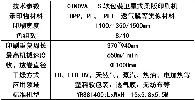 高端机型CINOVA.S印刷速度600m/min,该机型针对薄膜和纸张配置不同的收放卷及张力控制单元,在关键部件、干燥效率及智能化方面实现最佳配置组合,代表了航天华阳在卫星式柔印装备的最高水平。