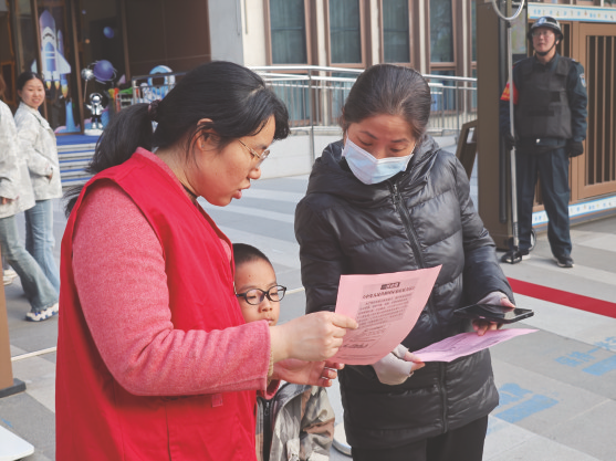 本报讯 为提高居民的法律意识,守护幸福家庭。近日,合肥市庐阳区杏花村街道汲桥新村社区妇联在辖区幼儿园门前开展《反家庭暴力法》主题宣传活动。巾帼志愿者们化身“普法使者”,用图文并茂的展板与精心设计的宣传单页,为接送孩子的家长们织就一张“反家暴防护网”。