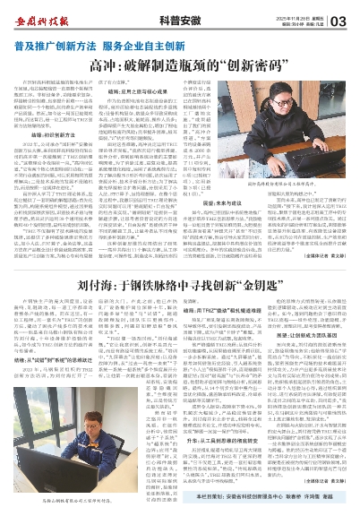 面向未来,刘付海的规划清晰而坚定,路径明确而务实:他始终坚持以“学用结合”为导向,不断深化一线创新实践,紧密围绕生产现场的技术难题展开持续攻关,力求产出更多高质量技术论文与具有实际应用价值的专利成果;同时,他积极承担起团队引领者的角色,主动分享个人经验与心得,通过组织案例讨论、进行系统的方法讲解,有效促进团队成员之间的互学互助、共同进步。“我期待推动创新思维成为团队的一种共识,在马钢这片充满激情与可能性的热土上真正落地生根、发芽成长。”