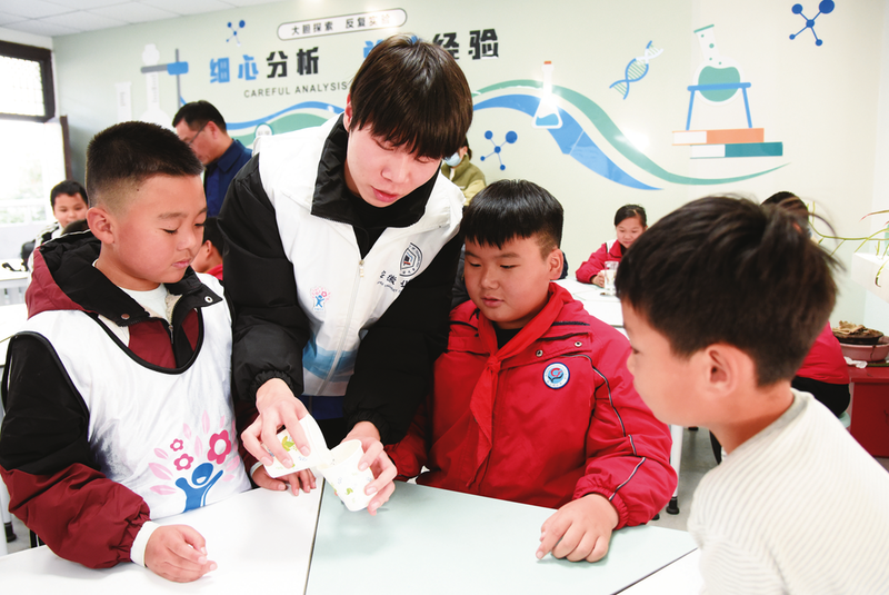 12月8日,马鞍山市花山区金家庄街道“幸福花花”服务项目联合安徽工业大学微数学院“数理行知”研究生科普志愿团队,走进新工房小学开展“光的折射”主题科普活动,以校地联动形式,将科普知识融入实践,提升了青少年的科学素养,为青少年科学启蒙注入动力。志愿者们通过趣味讲解,指导学生们发现生活中的折射现象、理解折射原理及产生原因,并结合简单小实验,让大家直观感受光影的奇妙,锻炼动手能力。活动还介绍了折射的生活应用,有效激发了同学们的科学探究兴趣。 通讯员 胡智慧 杨瑞华 摄