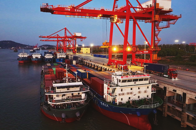 12月5日傍晚,芜湖市鸠江区,安徽港口集团芜湖港朱家桥国际集装箱码头一片繁忙。起重机有序装卸,货轮接连靠泊,集装箱卡车往来穿梭,港口正全力冲刺年末生产目标。
