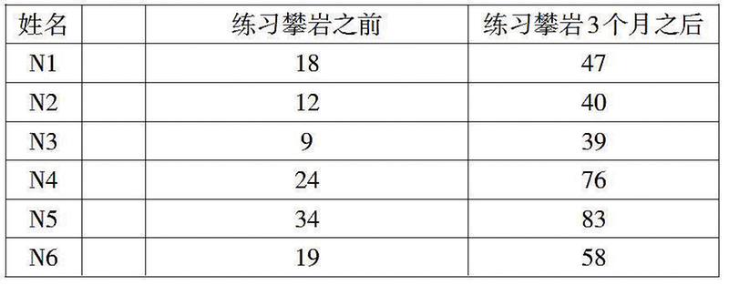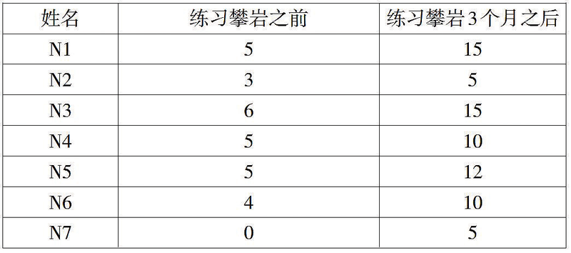 由表1可见,多数男生在攀岩训练前,力量水平远未达到普通标准,然而经过攀岩练习后,上肢力量均有不同程度的提升。除上肢力量外,其他力量方面亦有所增强。根据表2可观察到,多数女生在练习攀岩之前,手臂力量较弱,难以长时间承受自身重量,而攀岩运动需要克服重力向上攀爬,显著提升了她们的手臂耐力。表3闭眼单腿平衡时间(s)(n=6)
