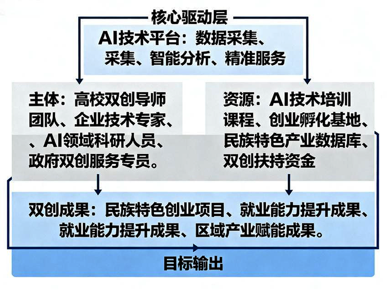 以培育高质量双创成果为目标,输出三类核心成果。一是民族特色创业项目,如基于AI的民族文化IP开发、智慧文旅服务项目等;二是就业能力提升成果,通过AI实训课程增强学生数字化技能,提高就业竞争力;三是区域产业赋能成果,推动双创项目与民族地区特色产业融合,助力当地经济转型升级(图1)。