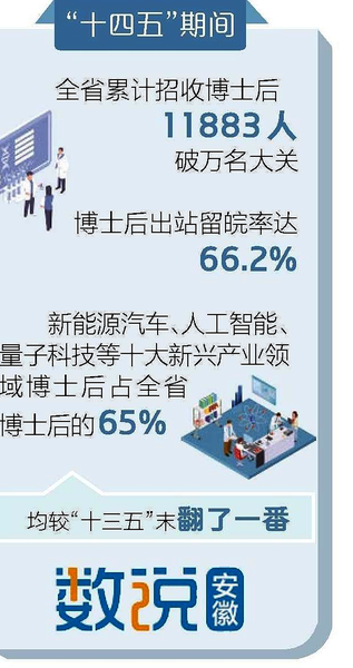 近日,记者从省人力资源和社会保障厅获悉,“十四五”期间,全省累计招收博士后11883人、破万名大关,较“十三五”末5614人翻了一番;博士后出站留皖率达66.2%,较“十三五”末32.2%翻了一番;新能源汽车、人工智能、量子科技等十大新兴产业领域博士后占全省博士后的65%,较“十三五”末31.5%翻了一番。