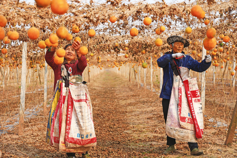 2025年12月28日,宿松县省属农垦华阳河农场瓜蒌种植基地,种植户在采摘成熟的瓜蒌。近年来,华阳河农场积极调整种植结构,发展特色瓜蒌种植,打造高效绿色经济,通过科技赋能提升种植效益、品牌培育拓宽市场渠道、三产融合延伸产业链条,推动瓜蒌产业化发展。今年种植的3000亩瓜蒌,亩均产值约5000元。越来越多的农户通过种植瓜蒌走上致富路。通讯员 李龙 摄