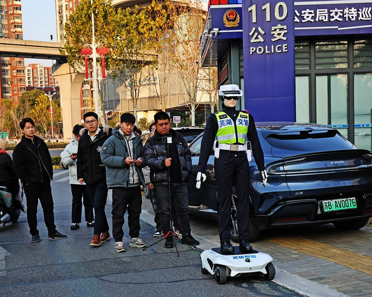 1月8日,安徽省芜湖市鸠江区中江大道与赤铸山路十字路口,一名机器人交警亮相街头,进行试岗,技术人员进行最后调试,吸引众多市民驻足。
