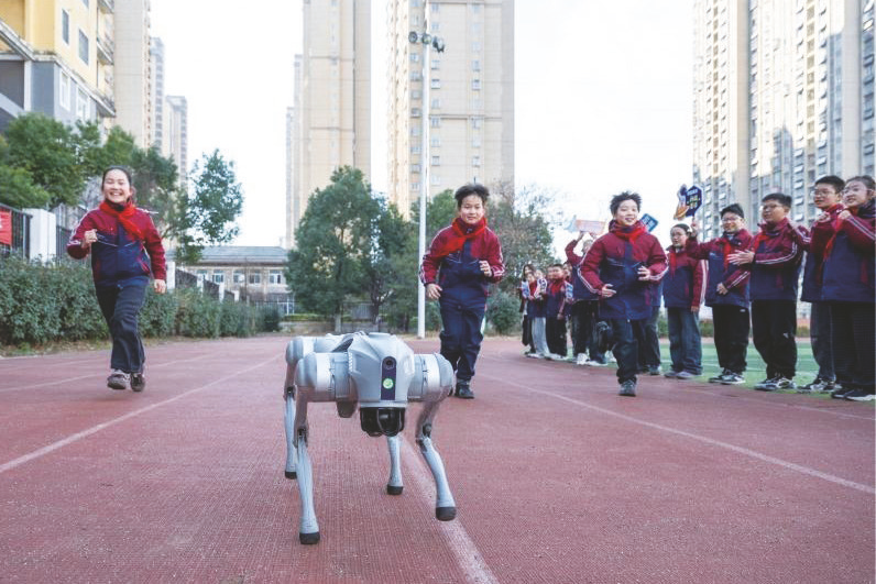 1月14日,在合肥市庐阳区林店街道六安路小学荣城花园分校,小学生正在与机器狗互动赛跑。当日,该校举办“科晚启航·未来已来”校园科技活动快闪三部曲主题活动。学生们通过观看机器人表演、与机器狗互动、动手制作“水火箭”等内容,近距离感受人工智能技术的魅力,不断拓宽科技视野,点燃对科技探索的热情和梦想。 赵明 摄