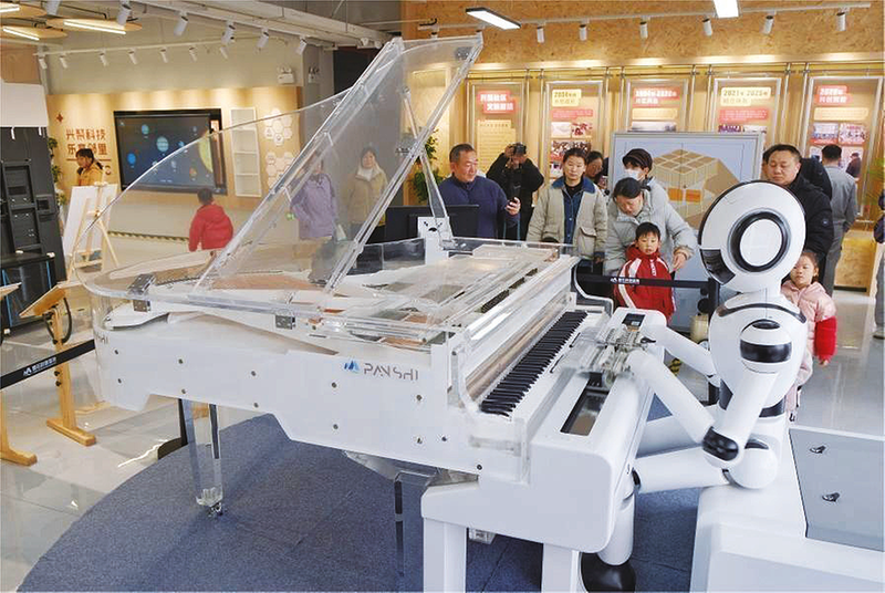 1月18日,合肥兴园社区星火科技馆正式对外开放。该馆以“科技赋能社区,创新启迪未来”为核心理念,通过多元功能空间打造“家门口的科学游乐场”,让前沿科技深度融入居民生活。图为观众在社区星火科技馆内,观看机器人弹奏优美的钢琴曲。