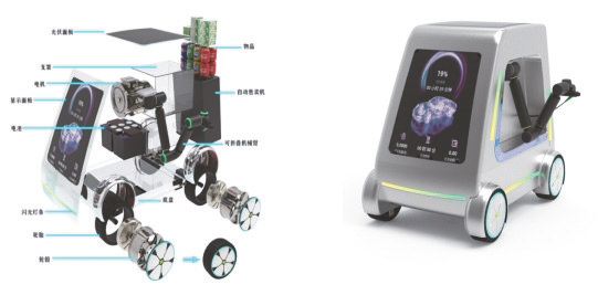 图1产品模型效果图 摘要:随着新能源汽车的快速普及,社会对智能化、灵活化充电设施的需求迫切。传统固定式充电桩位置受限、兼容性不足及体验单一,满足不了多样化的出行场景。针对此问题研究自动跟随式充电设备,融合激光雷达与视觉识别系统、全向底盘与自适应机械臂结构,实现自主定位、路径规划与避障功能,适配不同车型便捷充电。同时,利用太阳能储能系统实现低碳运转,并通过智能调度平台支持多车协同与路径优化。设计融入场景化人机交互,为用户提供引导、休憩与信息服务等,构建“充电—服务—体验”一体化体系。该设计在功能整合与使用体验方面提出了新的探索思路,为未来智慧交通与城市能源基础设施的可持续发展提供了设计参考与研究方向。