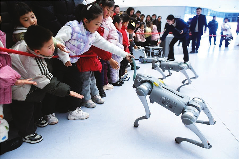 1月18日,阜阳市科技馆内,一些小朋友与机器狗互动,近距离感受科技魅力。随着寒假的临近,阜阳市科技馆开展“体验科学、放飞梦想”主题活动,在常规无人机表演等科普展示的基础上,增设机器狗展示和互动,让孩子们近距离感受科技魅力。