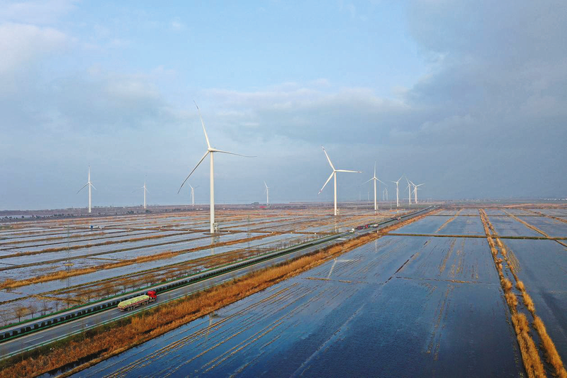 2月1日,安徽省宿松县省属农垦华阳河农场新洲渡风电场,大风车、国道347线与绿色田园相映成景,美如画卷画卷。