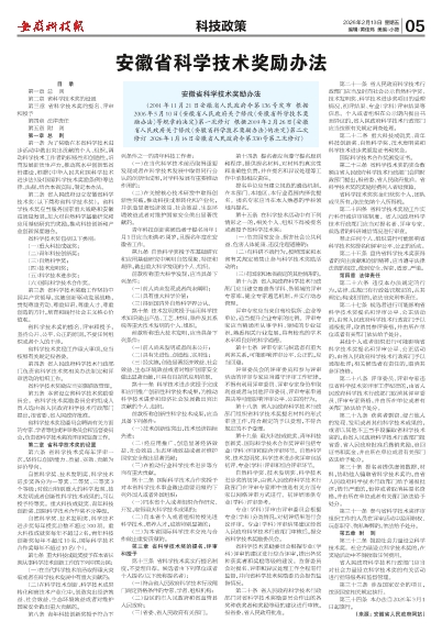 (2001年11月21日安徽省人民政府令第136号发布 根据2006年5月10日《安徽省人民政府关于修改〈安徽省科学技术奖励办法〉等规章的决定》第一次修订 根据2009年2月26日《安徽省人民政府关于修改〈安徽省科学技术奖励办法〉的决定》第二次修订 2026年1月16日安徽省人民政府令第330号第三次修订)