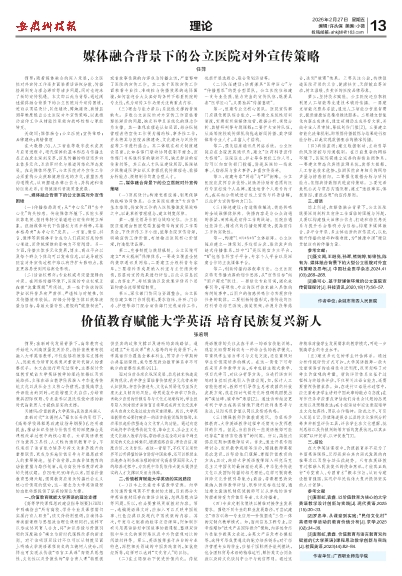 摘要:随着媒体融合的深入发展,公立医院对外宣传工作逐步面临着话语权分散、传播格局剧变与理念滞后等诸多问题,同时也迎来了新的宣传机遇。本文即以此为背景,通过阐述媒体融合背景下的公立医院对外宣传困境,进而从顶层设计、队伍建设、阵地建设、舆情监测等维度提出公立医院对外宣传策略,以此推动宣传工作从辅助性职能向战略性核心职能转变。