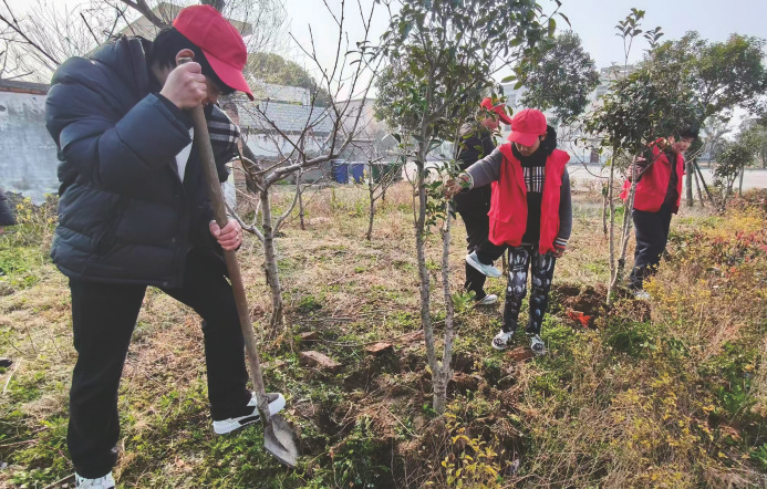 本报讯 在今年的植树节期间,阜阳市颍东区新华办事处中心学校团支部组织师生开展义务植树活动。活动现场,机关干部们热情高涨、分工协作,有的挥锹铲土、有的扶苗填坑,每一道工序都细致认真。师生们以实际行动美化校园及周边环境,为春日的乡村增添了一抹盎然绿意。 (郝常龙)