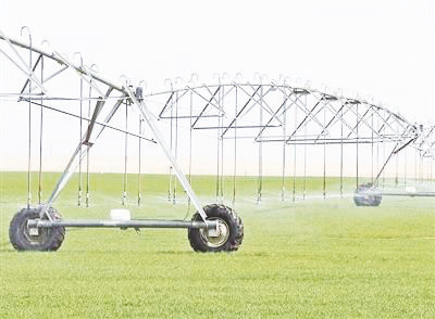 这些“大家伙”是指针式喷灌机,长380多米。笔者走到支座旁近距离观察发现,一个个喷头从上方水管处垂下,像花洒一样,把麦苗冲洗得绿油油。