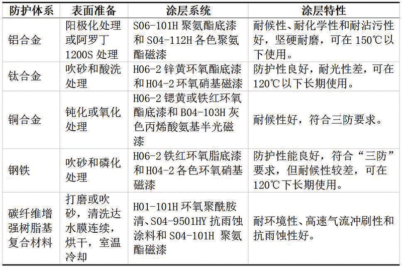 针对海上高温、高湿、高盐雾环境对直升机维护带来的严峻挑战,现有研究已发展出多种材料防护体系,并根据不同体系的涂层修复技术和特性开发出相关维护技术,旨在辨析其优劣与应用场景,为该领域的技术选型与体系优化提供依据。本文系统阐述了五种现代典型材料防护体系,如表1所示。