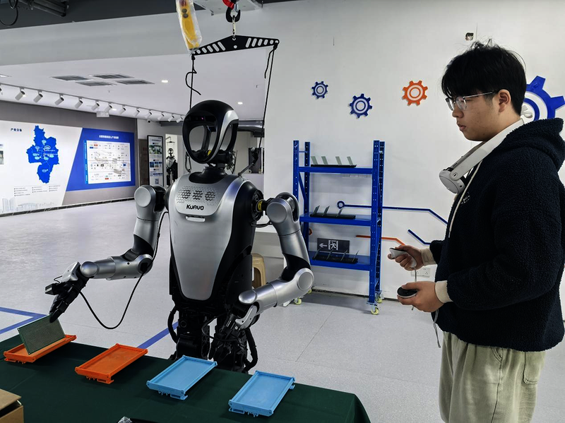 “我学的是机电专业,在这里第一次真正‘成为’了机器人。”董烨笑着对记者说。他通过一套力反馈手柄,能清晰感知到机械手指触碰PCB边缘时的微小阻力。“PCB电路板为精密电子元件,需从货架取出并精准放置到工装桌上,人工操作易造成划伤、静电损伤或错位,影响后续焊接质量。通过训练机器人高精度抓取柔性/薄片状物体,可以实现毫米级定位放置,具备防碰撞与抗扰动能力。”