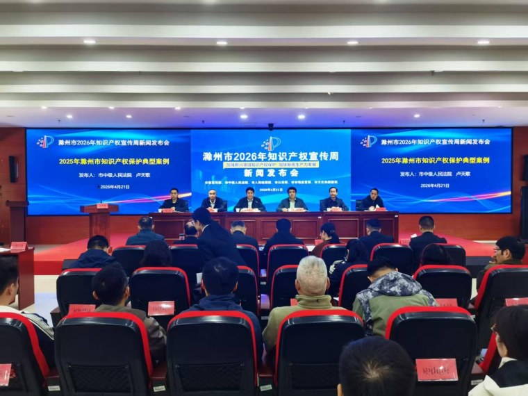滁州市2026年知识产权宣传周新闻发布会现场。 本报滁州讯(全媒体记者 朱晓平)4月20日,滁州市举行2026年知识产权宣传周新闻发布会,发布2025年度知识产权保护典型案例与数据分析报告,全面展现全市知识产权工作成效。